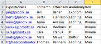 - Den måste innehålla minst en kolumn med information om E-postadresser.