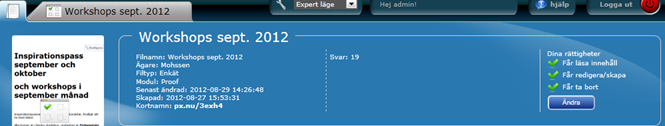 Rättigheter till filen kan ändras här. Förutsättning är att man får lov att ändra rättigheter. Basfunktionalitet för vilka som får se enkäten/anmälning finns under inställningar.