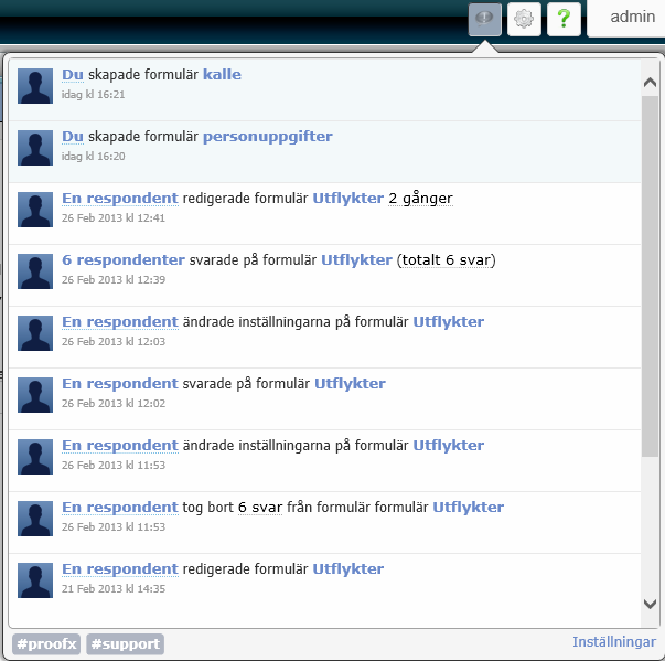 Här ser du vad som händer på ditt konto. Vilka formulär som blir besvarade och eventuell information från ProofX teamet syns här.