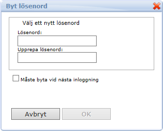 Om kryssrutan Måste byta vid nästa inloggning markeras får användaren upp en inforuta vid nästa inloggning där användaren får välja ett nytt lösenord.