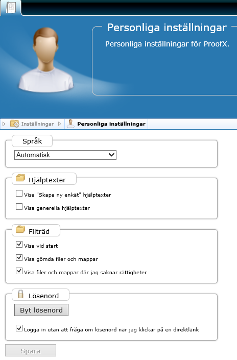 Välj vilket språk du vill använda i ProofX. Om det står atuomatiskt så känner den av webbläsarens språkinställningar. I dagsläget finns endast svenska och engelska.