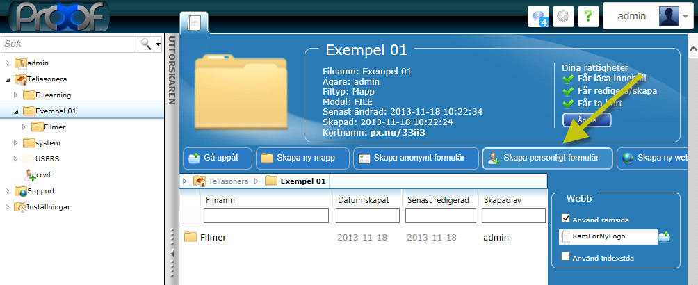 Nu är det dags att skapa själva frågeformuläret. Markera där du vill lägga frågeformuläret i mappstrukturen i Utforskaren i vänstra delen av webbläsarfönstret. Tryck på Skapa personligt formulär knappen i högra delen av webbläsarfönstret.