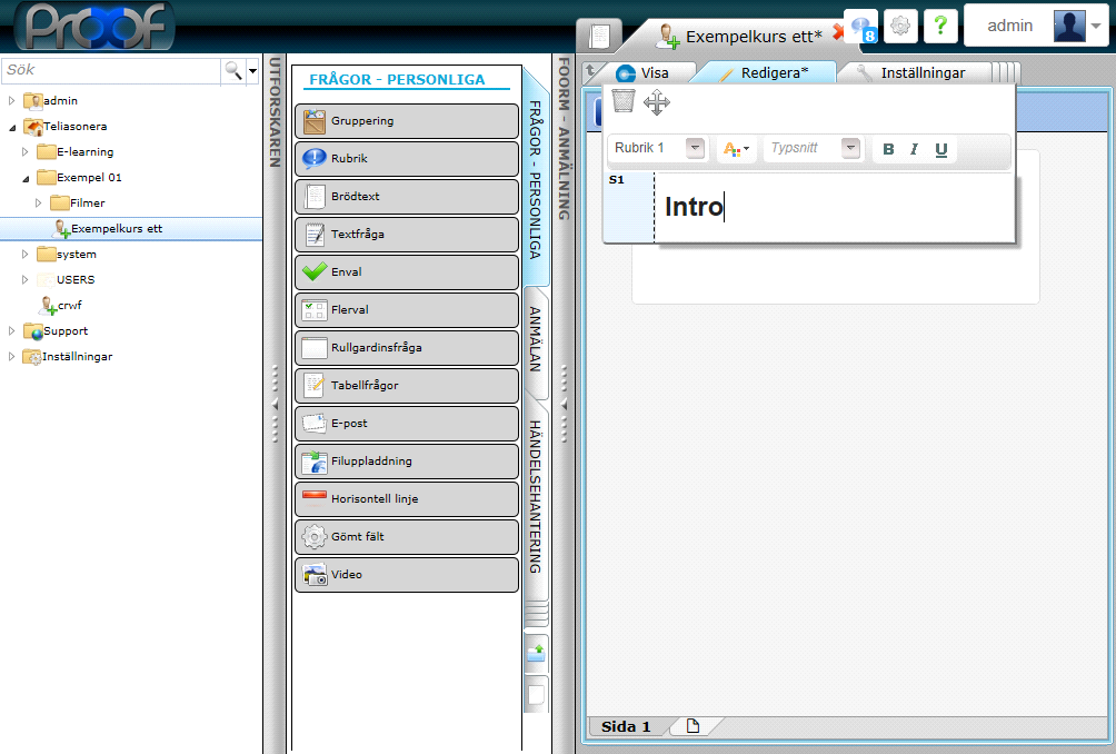 Markera i den rubrik du just dragit in. Skriv En lämplig rubrik. Notera att allt du gör i arbetsytan kommer synas i det färdiga formuläret. I vårt exempel skriver vi Intro som rubrik. När man kommer till själva webbsidan (som vi håller på att bygga här på redigerafliken) kommer det stå Intro som rubrik högst upp på första sidan.