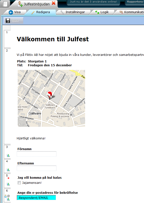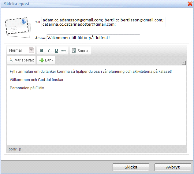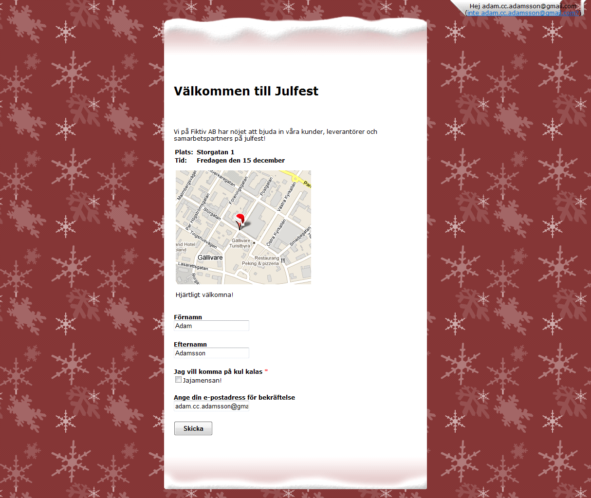 1. Lathunden går igenom att göra ett riktat utskick. Som exempelfoorm används en inbjudan till julfest av det fiktiva företaget Fiktiv AB.