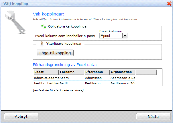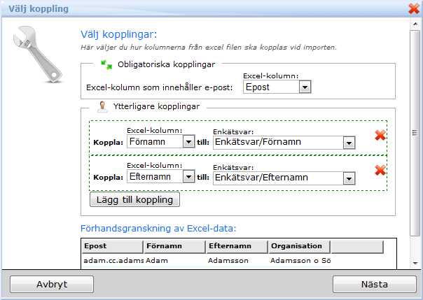 9. Om du vill använda fler kolumner från excelfilen trycker du på Lägg till koppling
