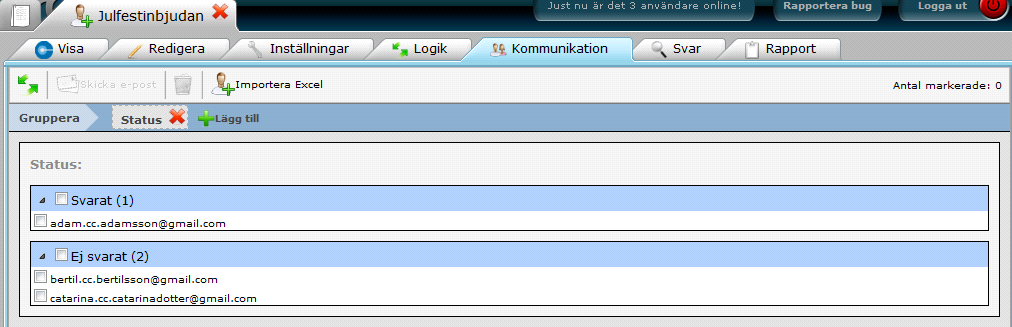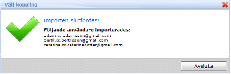 14. Information om importen visas när den är klar. I vårt exempel har 3 mottagare lagts till med tillhörande data (förnamn och efternamn och epostadress)