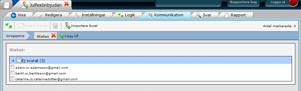 16. Kryssa i Ej svarat. (Ej svarat betyder de mottagare vi laddat up och som ännu inte besvarat vår Foorm. Detta för att underlätta påminnelseutskick).
