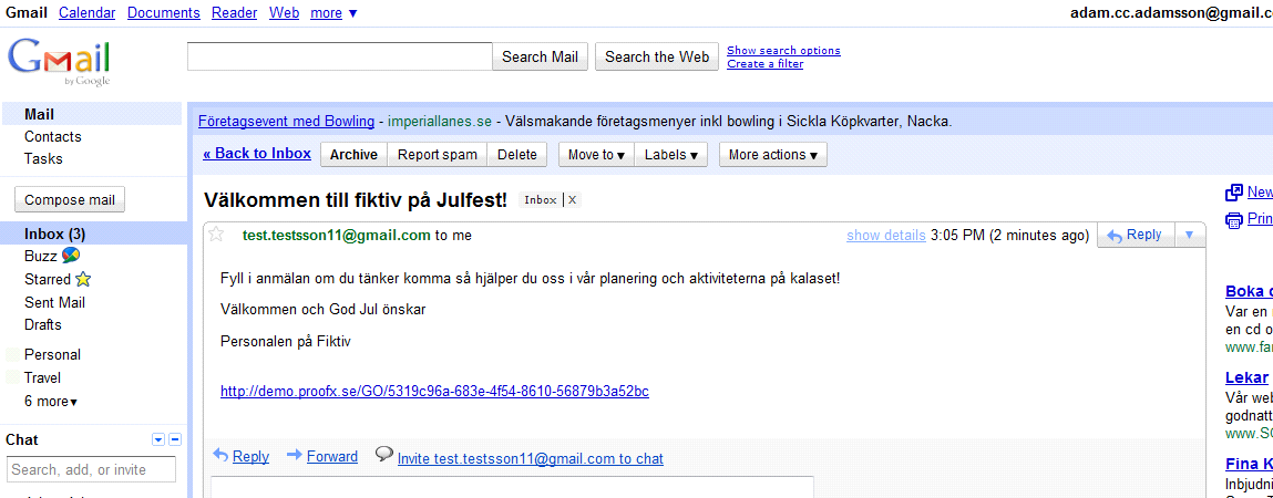 20. Här ser vi en av mottagarnas inbox. I eposten som skickats finns vår text samt en länk till enkäten.