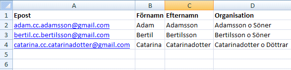 Notera! Det är bara e-post kolumnen som är obligatorisk i excelfilen!