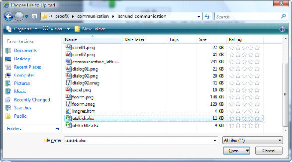 6. Välj excelfilen med mottagare på din hårddisk via en ordinär filväljare. Nedan är en bild från en filväljare på windows 7, engelsk version.