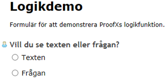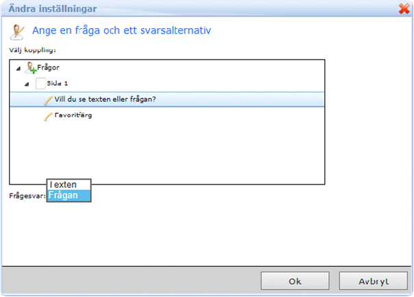 Notera rullgardinsmenyn Frågesvar längst ner. Var noga med att välja det frågesvar som skall utläsa händelsen (vanligen visa/dölja annat material i formuläret).