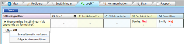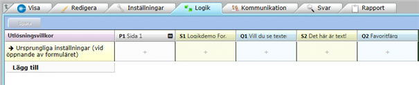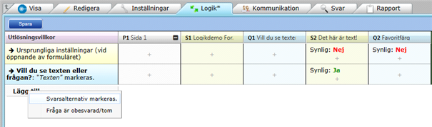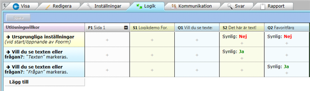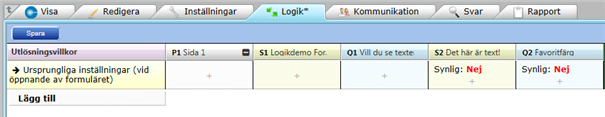 När vi har en ny rad lägger vi till att frågan skall visas. Logikfliken ser nu ut såhär: