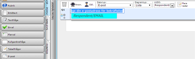 - Skapa ett formulär. Säkerställ att formuläret innehåller en "E-post" fråga. Denna fråga skall när den lagts till formuläret ha en blåaktig bakgrund och texten "Respondent/EMAIL" i textfältet och börjar med frågetexten "Ange din e-postadress för bekräftelse". Frågetexten kan ändras till vad som passar just ditt formulär.
