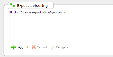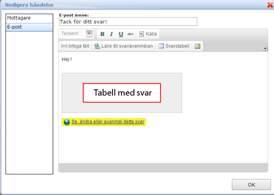 - När epostmeddelandet skickas kommer "Tabell med svar" ersättas med vad respondenten svarade på de olika frågorna i formuläret. Det gula fältet "Se, ändra eller avanmäl detta svar" kommer att vara en länk som går till respondentens svar. Om formuläret tillåter avanmälning eller att respondenten ändrar på svar kommer det att kunna göras via den här länken.